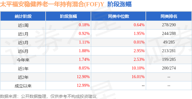 证券之星消息,日前太平福安稳健养老一年持有混合(FOF)Y基金公布一季报,2026年一季度最新规模0.01亿元,季度净值涨幅为0.97%。