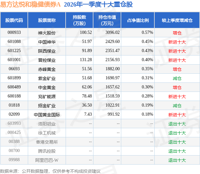 从基金规模来看,易方达悦和稳健债券A基金2026年一季度公布的基金规模为35.18亿元,较上一期规模8826.45万元变化了34.3亿元,环比变化了3885.84%。该基金最新一期资产配置为:股票占净值比9.89%,债券占净值比96.71%,现金占净值比0.27%。从基金持仓来看,该基金当季前十大股票仓位达3.46%,第一大重仓股为神火股份(000933),持仓占比为0.57%。