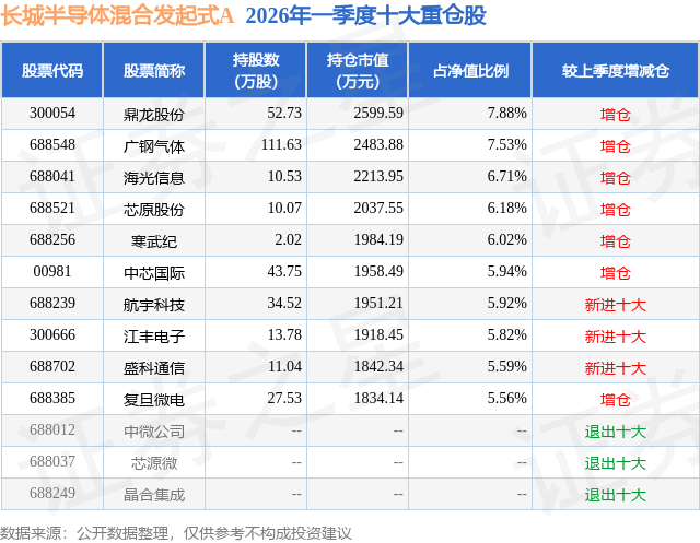 从基金规模来看,长城半导体混合发起式A基金2026年一季度公布的基金规模为1.34亿元,较上一期规模5052.55万元变化了8368.15万元,环比变化了165.62%。该基金最新一期资产配置为:股票占净值比93.88%,无债券类资产,现金占净值比8.26%。从基金持仓来看,该基金当季前十大股票仓位达63.15%,第一大重仓股为鼎龙股份(300054),持仓占比为7.88%。