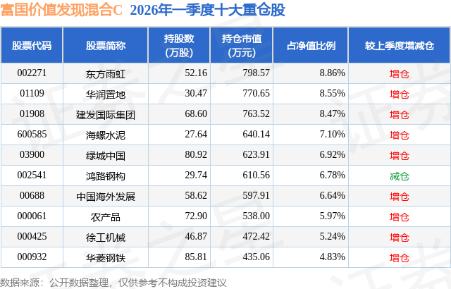 从基金规模来看,富国价值发现混合C基金2026年一季度公布的基金规模为0.28亿元,较上一期规模3399.31万元变化了-561.76万元,环比变化了-16.53%。该基金最新一期资产配置为:股票占净值比92.29%,无债券类资产,现金占净值比8.14%。从基金持仓来看,该基金当季前十大股票仓位达69.36%,第一大重仓股为东方雨虹(002271),持仓占比为8.86%。