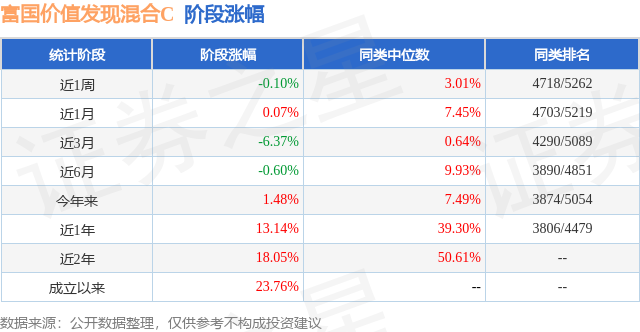 从业绩表现来看,富国价值发现混合C基金过去一年净值涨幅为13.14%,在同类基金中排名3806/4479,同类基金过去一年净值涨幅中位数为39.3%。而基金过去一年的最大回撤为-15.48%,成立以来的最大回撤为-22.93%。