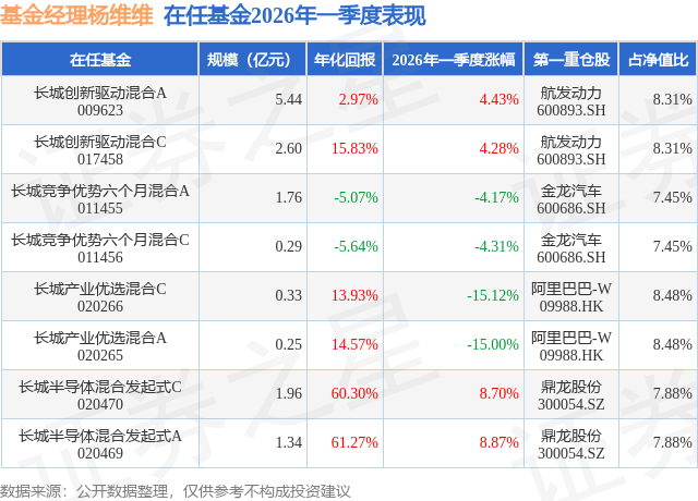 证券之星消息,日前长城半导体混合发起式C基金公布一季报,2026年一季度最新规模1.96亿元,季度净值涨幅为8.7%。