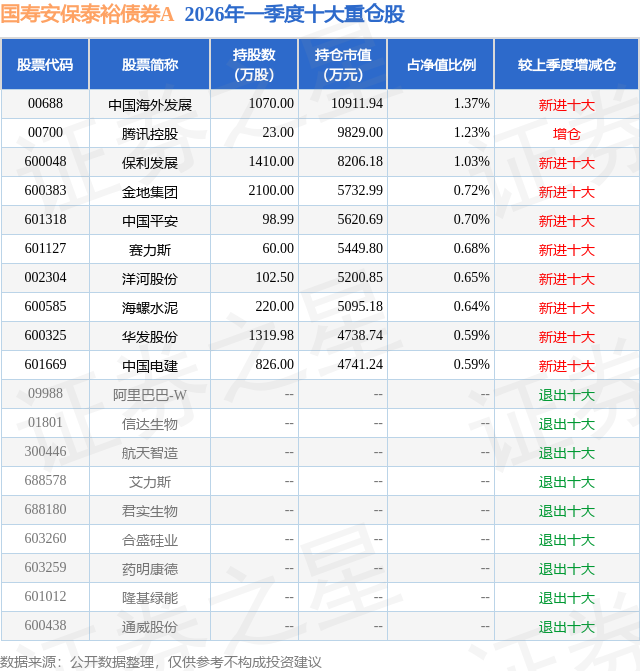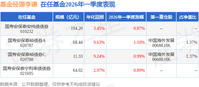 从基金规模来看,国寿安保泰裕债券A基金2026年一季度公布的基金规模为68.44亿元,较上一期规模4.21亿元变化了64.24亿元,环比变化了1527.2%。该基金最新一期资产配置为:股票占净值比18.7%,债券占净值比89.24%,现金占净值比1.21%。从基金持仓来看,该基金当季前十大股票仓位达8.2%,第一大重仓股为中国海外发展(00688),持仓占比为1.37%。