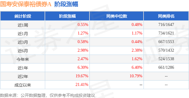 从业绩表现来看,国寿安保泰裕债券A基金过去一年净值涨幅为6.3%,在同类基金中排名661/1286,同类基金过去一年净值涨幅中位数为6.4%。而基金过去一年的最大回撤为-2.23%,成立以来的最大回撤为-2.23%。