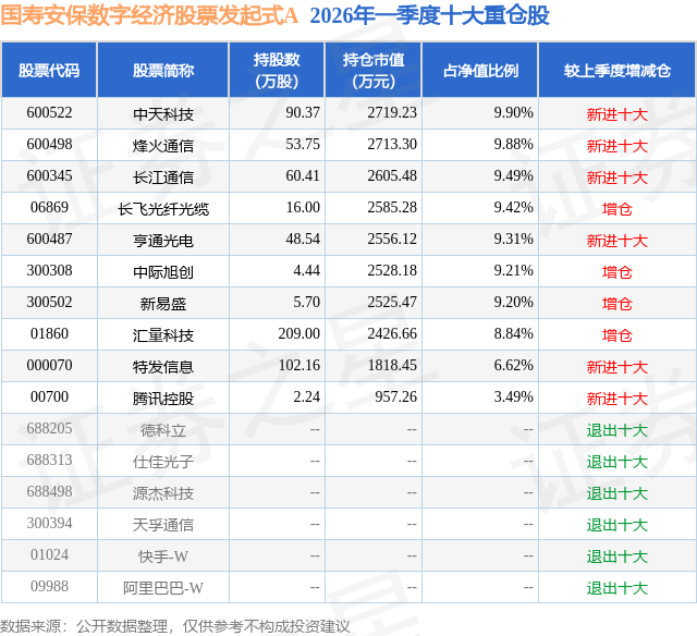 从基金规模来看,国寿安保数字经济股票发起式A基金2026年一季度公布的基金规模为0.66亿元,较上一期规模1328.93万元变化了5265.15万元,环比变化了396.19%。该基金最新一期资产配置为:股票占净值比88.36%,债券占净值比0.59%,现金占净值比21.73%。从基金持仓来看,该基金当季前十大股票仓位达85.36%,第一大重仓股为中天科技(600522),持仓占比为9.9%。