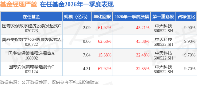 证券之星消息,日前国寿安保数字经济股票发起式A基金公布一季报,2026年一季度最新规模0.66亿元,季度净值涨幅为45.38%。