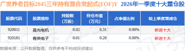从基金规模来看,广发养老目标2045三年持有混合发起式(FOF)Y基金2026年一季度公布的基金规模为0.17亿元,较上一期规模156.34万元变化了1553.33万元,环比变化了993.59%。该基金最新一期资产配置为:无股票类资产,无债券类资产,现金占净值比6.68%。从基金持仓来看,该基金当季前十大股票仓位达0.0%,第一大重仓股为晨光电机(920011),持仓占比为0.0%。
