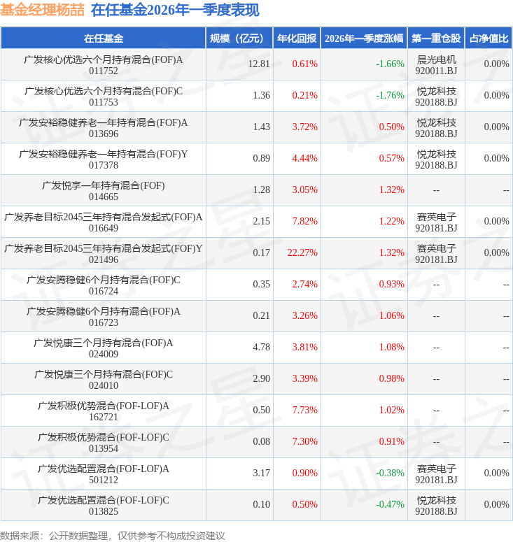 证券之星消息,日前广发养老目标2045三年持有混合发起式(FOF)Y基金公布一季报,2026年一季度最新规模0.17亿元,季度净值涨幅为1.32%。