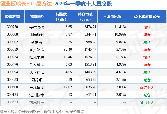 从基金规模来看,创业板成长ETF易方达基金2026年一季度公布的基金规模为3.04亿元,较上一期规模2.8亿元变化了2452.8万元,环比变化了8.76%。该基金最新一期资产配置为:股票占净值比99.73%,无债券类资产,现金占净值比0.32%。从基金持仓来看,该基金当季前十大股票仓位达58.96%,第一大重仓股为宁德时代(300750),持仓占比为11.41%。