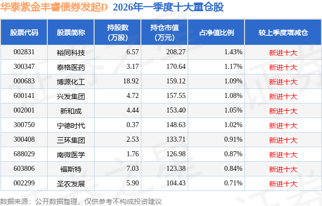 从基金规模来看,华泰紫金丰睿债券发起D基金2026年一季度公布的基金规模为0.79亿元,较上一期规模nan万元变化了nan万元,环比变化了nan%。该基金最新一期资产配置为:股票占净值比19.62%,债券占净值比69.6%,现金占净值比12.64%。从基金持仓来看,该基金当季前十大股票仓位达10.17%,第一大重仓股为裕同科技(002831),持仓占比为1.43%。