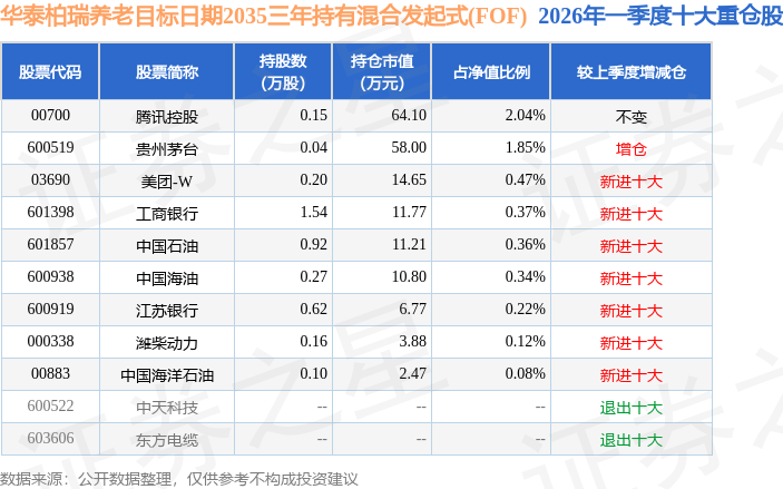 从基金规模来看,华泰柏瑞养老目标日期2035三年持有混合发起式(FOF)基金2026年一季度公布的基金规模为0.31亿元,较上一期规模2831.8万元变化了309.5万元,环比变化了10.93%。该基金最新一期资产配置为:股票占净值比5.85%,债券占净值比4.81%,现金占净值比6.21%。从基金持仓来看,该基金当季前十大股票仓位达5.85%,第一大重仓股为腾讯控股(00700),持仓占比为2.04%。