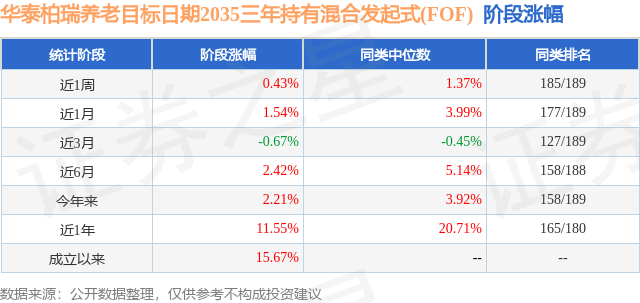 从业绩表现来看,华泰柏瑞养老目标日期2035三年持有混合发起式(FOF)基金过去一年净值涨幅为11.55%,在同类基金中排名165/180,同类基金过去一年净值涨幅中位数为20.71%。而基金过去一年的最大回撤为-5.47%,成立以来的最大回撤为-5.47%。