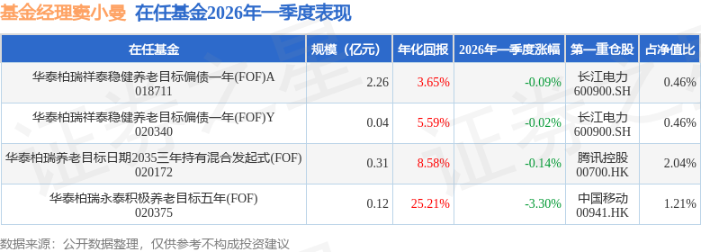 证券之星消息,日前华泰柏瑞养老目标日期2035三年持有混合发起式(FOF)基金公布一季报,2026年一季度最新规模0.31亿元,季度净值涨幅为-0.14%。
