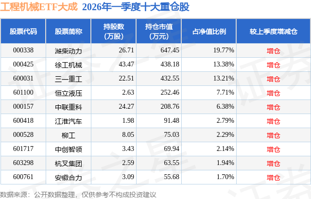从基金规模来看,工程机械ETF大成基金2026年一季度公布的基金规模为0.33亿元,较上一期规模1500.41万元变化了1773.8万元,环比变化了118.22%。该基金最新一期资产配置为:股票占净值比98.31%,无债券类资产,现金占净值比1.8%。从基金持仓来看,该基金当季前十大股票仓位达71.31%,第一大重仓股为潍柴动力(000338),持仓占比为19.77%。