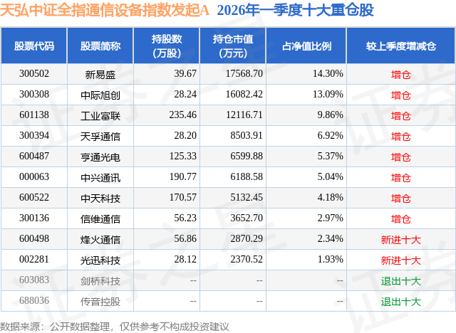 从基金规模来看,天弘中证全指通信设备指数发起A基金2026年一季度公布的基金规模为3.31亿元,较上一期规模966.29万元变化了3.21亿元,环比变化了3322.06%。该基金最新一期资产配置为:股票占净值比94.9%,无债券类资产,现金占净值比5.82%。从基金持仓来看,该基金当季前十大股票仓位达66.0%,第一大重仓股为新易盛(300502),持仓占比为14.3%。