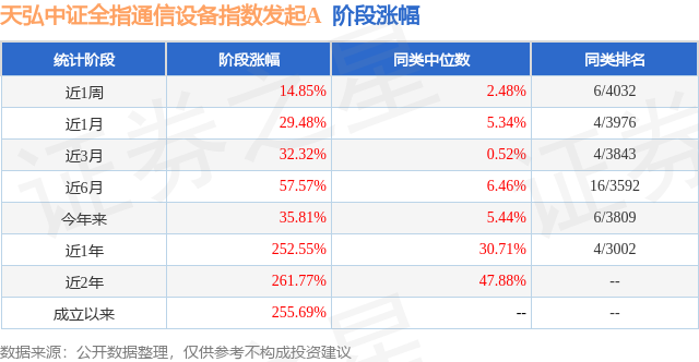 从业绩表现来看,天弘中证全指通信设备指数发起A基金过去一年净值涨幅为252.55%,在同类基金中排名4/3002,同类基金过去一年净值涨幅中位数为30.71%。而基金过去一年的最大回撤为-17.12%,成立以来的最大回撤为-30.16%。