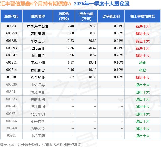 从基金规模来看,汇丰晋信慧鑫6个月持有期债券A基金2026年一季度公布的基金规模为1.02亿元,较上一期规模1378.66万元变化了8792.34万元,环比变化了637.75%。该基金最新一期资产配置为:股票占净值比1.52%,债券占净值比97.02%,现金占净值比7.23%。从基金持仓来看,该基金当季前十大股票仓位达1.53%,第一大重仓股为中国海洋石油(00883),持仓占比为0.31%。