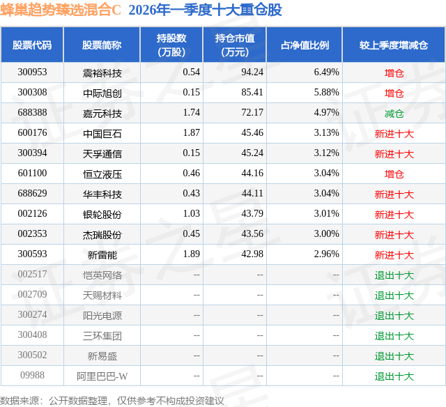 证券之星消息,日前蜂巢趋势臻选混合C基金公布一季报,2026年一季度最新规模0.06亿元,季度净值涨幅为-4.67%。
