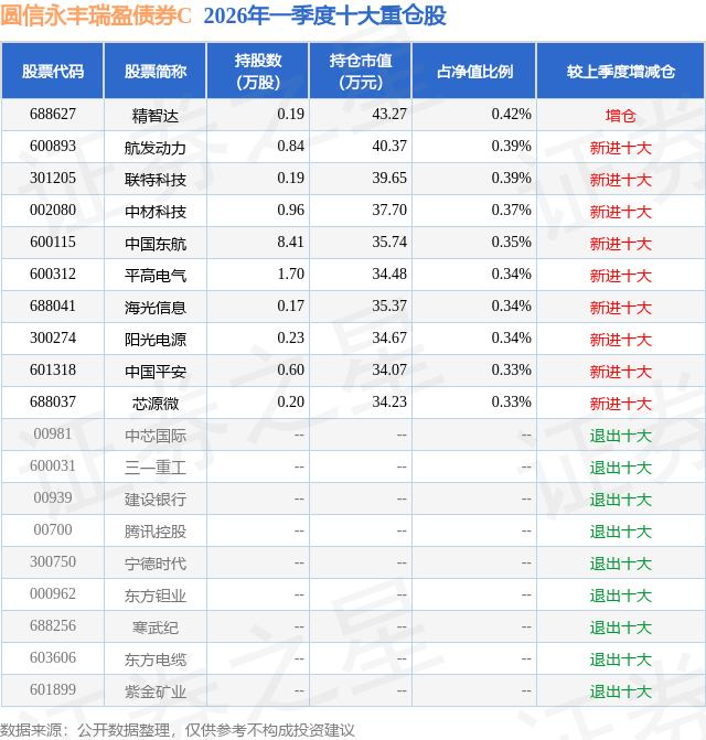 从基金规模来看,圆信永丰瑞盈债券C基金2026年一季度公布的基金规模为0.52亿元,较上一期规模4488.96万元变化了735.65万元,环比变化了16.39%。该基金最新一期资产配置为:股票占净值比11.17%,债券占净值比80.78%,现金占净值比2.72%。从基金持仓来看,该基金当季前十大股票仓位达3.6%,第一大重仓股为精智达(688627),持仓占比为0.42%。