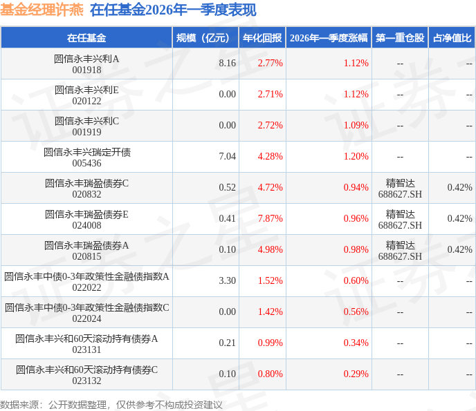 证券之星消息,日前圆信永丰瑞盈债券C基金公布一季报,2026年一季度最新规模0.52亿元,季度净值涨幅为0.94%。