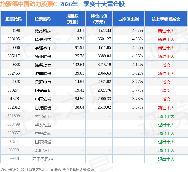 从基金规模来看,施罗德中国动力股票C基金2026年一季度公布的基金规模为2.65亿元,较上一期规模3213.42万元变化了2.33亿元,环比变化了725.66%。该基金最新一期资产配置为:股票占净值比85.75%,无债券类资产,现金占净值比14.27%。从基金持仓来看,该基金当季前十大股票仓位达40.78%,第一大重仓股为源杰科技(688498),持仓占比为4.67%。