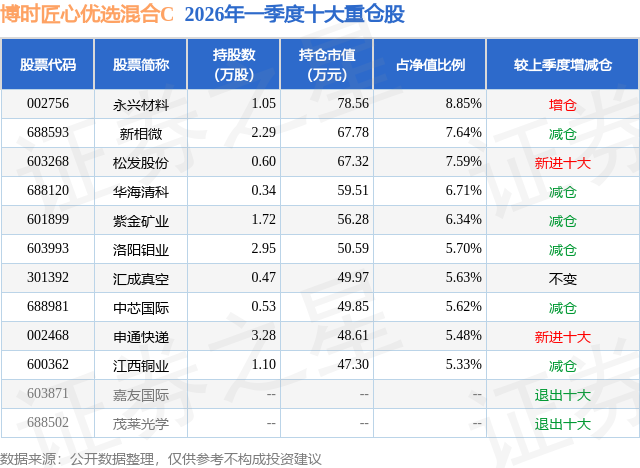 从基金规模来看,博时匠心优选混合C基金2026年一季度公布的基金规模为0.04亿元,较上一期规模52.51万元变化了327.73万元,环比变化了624.17%。该基金最新一期资产配置为:股票占净值比94.82%,债券占净值比6.49%,现金占净值比2.95%。从基金持仓来看,该基金当季前十大股票仓位达64.89%,第一大重仓股为永兴材料(002756),持仓占比为8.85%。