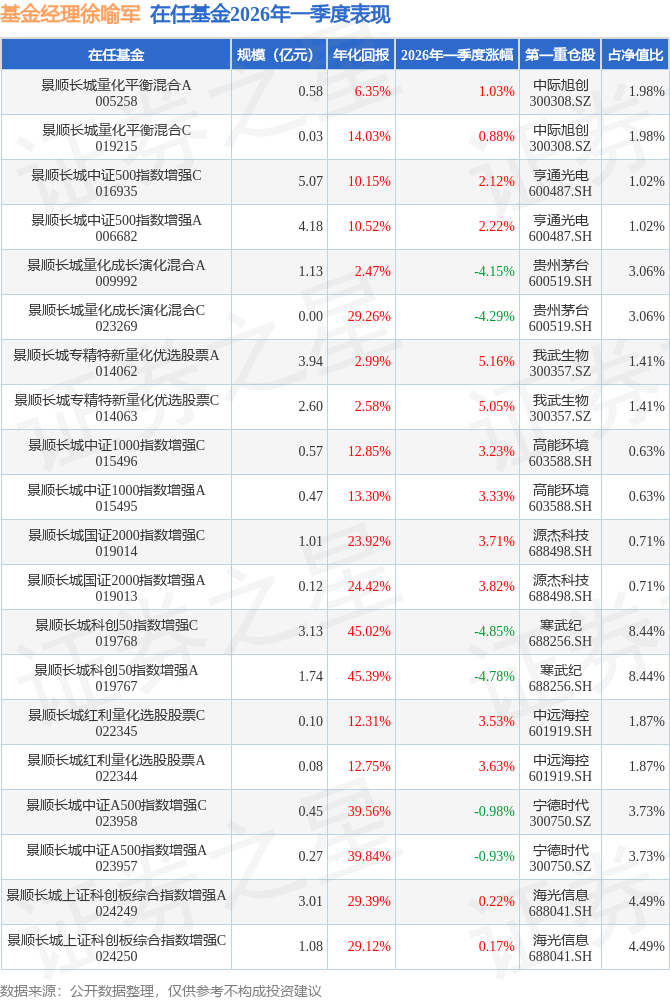 证券之星消息,日前景顺长城量化成长演化混合C基金公布一季报,2026年一季度最新规模0.0亿元,季度净值涨幅为-4.29%。