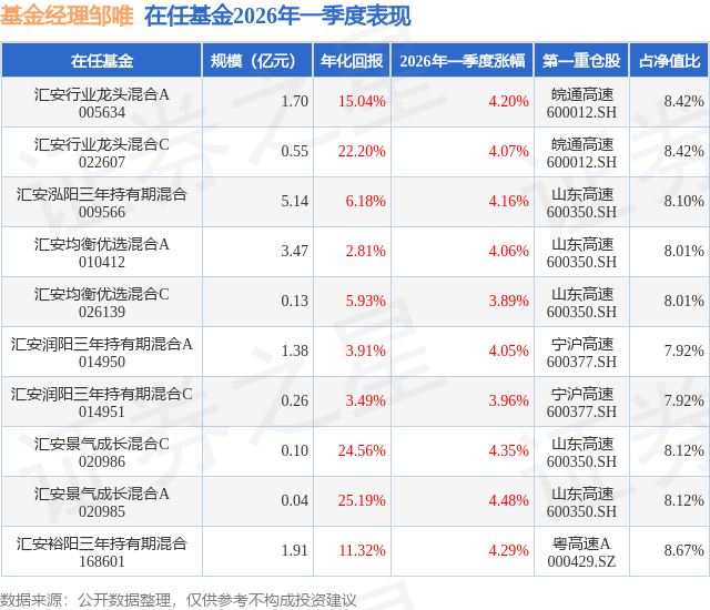 从基金规模来看,汇安景气成长混合A基金2026年一季度公布的基金规模为0.04亿元。该基金最新一期资产配置为:股票占净值比94.31%,无债券类资产,现金占净值比5.98%。从基金持仓来看,该基金当季前十大股票仓位达60.39%,第一大重仓股为山东高速(600350),持仓占比为8.12%。