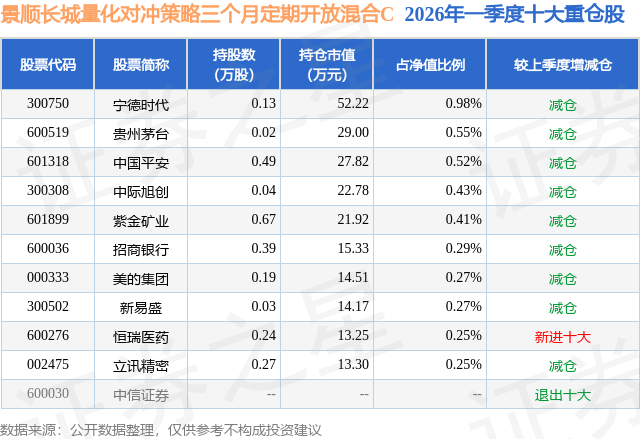 从基金规模来看,景顺长城量化对冲策略三个月定期开放混合C基金2026年一季度公布的基金规模为0.1亿元。该基金最新一期资产配置为:股票占净值比31.47%,无债券类资产,现金占净值比65.93%。从基金持仓来看,该基金当季前十大股票仓位达4.22%,第一大重仓股为宁德时代(300750),持仓占比为0.98%。