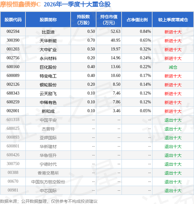 从基金规模来看,摩根恒鑫债券C基金2026年一季度公布的基金规模为0.29亿元。该基金最新一期资产配置为:股票占净值比2.96%,债券占净值比99.09%,现金占净值比3.81%。从基金持仓来看,该基金当季前十大股票仓位达2.87%,第一大重仓股为比亚迪(002594),持仓占比为0.84%。