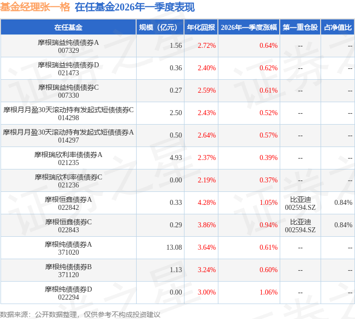 证券之星消息,日前摩根恒鑫债券C基金公布一季报,2026年一季度最新规模0.29亿元,季度净值涨幅为0.94%。