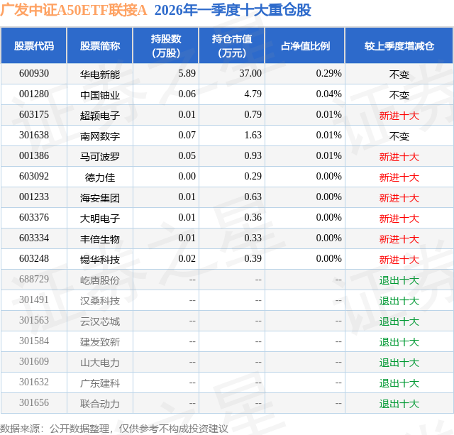 从基金规模来看,广发中证A50ETF联接A基金2026年一季度公布的基金规模为0.26亿元。该基金最新一期资产配置为:股票占净值比0.37%,债券占净值比2.0%,现金占净值比3.34%。从基金持仓来看,该基金当季前十大股票仓位达0.36%,第一大重仓股为华电新能(600930),持仓占比为0.29%。