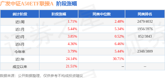 从业绩表现来看,广发中证A50ETF联接A基金过去一年净值涨幅为24.14%,在同类基金中排名,同类基金过去一年净值涨幅中位数为30.71%。而基金过去一年的最大回撤为-7.61%,成立以来的最大回撤为-7.61%。