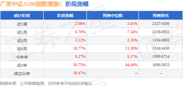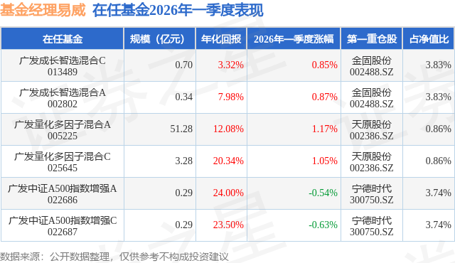 证券之星消息,日前广发中证A500指数增强C基金公布一季报,2026年一季度最新规模0.29亿元,季度净值涨幅为-0.63%。