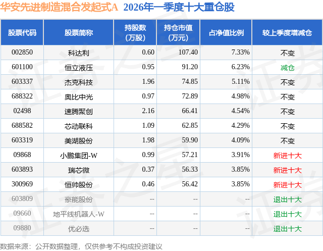 证券之星消息,日前华安先进制造混合发起式A基金公布一季报,2026年一季度最新规模0.12亿元,季度净值涨幅为-15.24%。