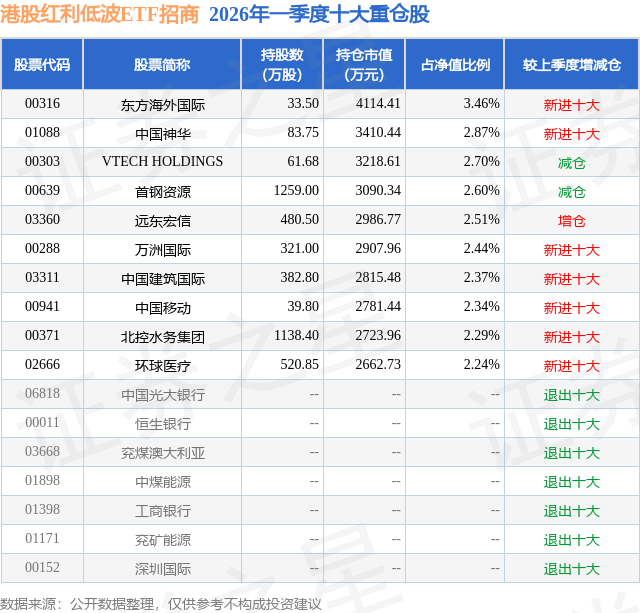 从基金规模来看,港股红利低波ETF招商基金2026年一季度公布的基金规模为11.9亿元,较上一期规模13.39亿元变化了-1.49亿元,环比变化了-11.1%。该基金最新一期资产配置为:股票占净值比99.7%,无债券类资产,现金占净值比3.7%。从基金持仓来看,该基金当季前十大股票仓位达25.82%,第一大重仓股为东方海外国际(00316),持仓占比为3.46%。
