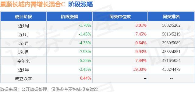 证券之星消息,日前景顺长城内需增长混合C基金公布一季报,2026年一季度最新规模0.02亿元,季度净值涨幅为-5.4%。