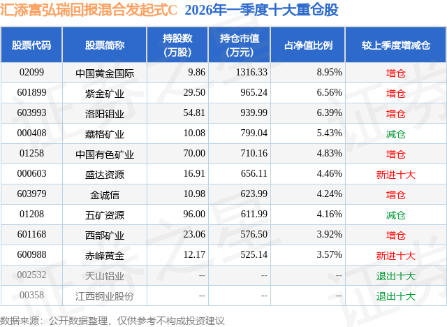 从基金规模来看,汇添富弘瑞回报混合发起式C基金2026年一季度公布的基金规模为0.73亿元。该基金最新一期资产配置为:股票占净值比88.3%,无债券类资产,现金占净值比9.75%。从基金持仓来看,该基金当季前十大股票仓位达52.51%,第一大重仓股为中国黄金国际(02099),持仓占比为8.95%。