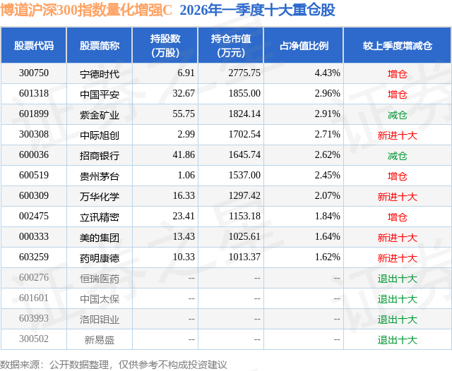 从基金规模来看,博道沪深300指数量化增强C基金2026年一季度公布的基金规模为2.18亿元。该基金最新一期资产配置为:股票占净值比93.38%,债券占净值比5.3%,现金占净值比1.68%。从基金持仓来看,该基金当季前十大股票仓位达25.25%,第一大重仓股为宁德时代(300750),持仓占比为4.43%。