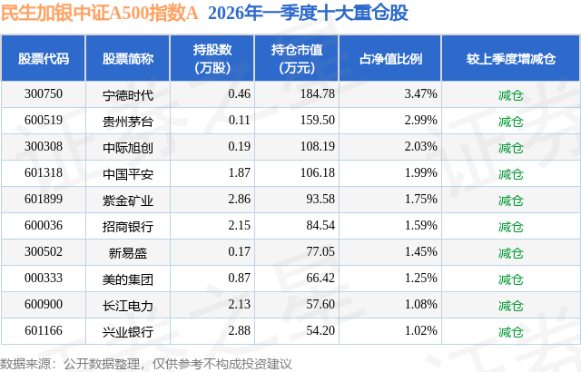从基金规模来看,民生加银中证A500指数A基金2026年一季度公布的基金规模为0.12亿元。该基金最新一期资产配置为:股票占净值比92.5%,无债券类资产,现金占净值比7.56%。从基金持仓来看,该基金当季前十大股票仓位达18.62%,第一大重仓股为宁德时代(300750),持仓占比为3.47%。