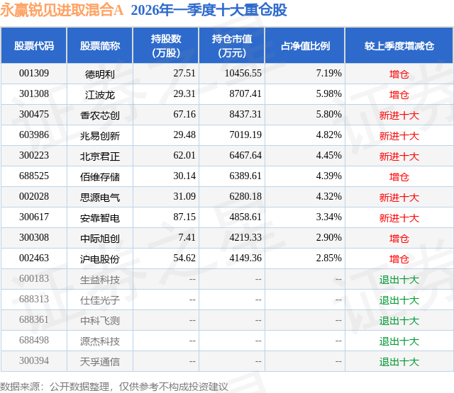 从基金规模来看,永赢锐见进取混合A基金2026年一季度公布的基金规模为5.19亿元。该基金最新一期资产配置为:股票占净值比90.52%,债券占净值比0.57%,现金占净值比10.66%。从基金持仓来看,该基金当季前十大股票仓位达46.04%,第一大重仓股为德明利(001309),持仓占比为7.19%。