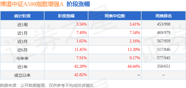 从业绩表现来看,博道中证A500指数增强A基金过去一年净值涨幅为42.28%,在同类基金中排名350/651,同类基金过去一年净值涨幅中位数为44.44%。而基金过去一年的最大回撤为-9.42%,成立以来的最大回撤为-10.73%。