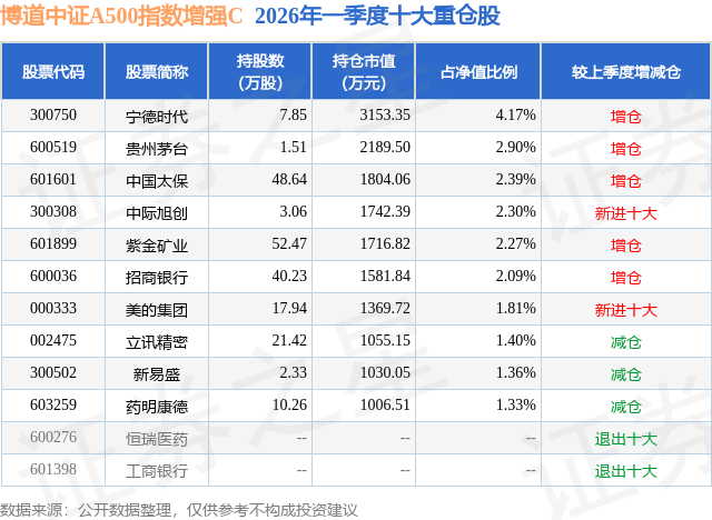 从基金规模来看,博道中证A500指数增强C基金2026年一季度公布的基金规模为3.34亿元。该基金最新一期资产配置为:股票占净值比92.9%,债券占净值比5.61%,现金占净值比1.37%。从基金持仓来看,该基金当季前十大股票仓位达22.02%,第一大重仓股为宁德时代(300750),持仓占比为4.17%。