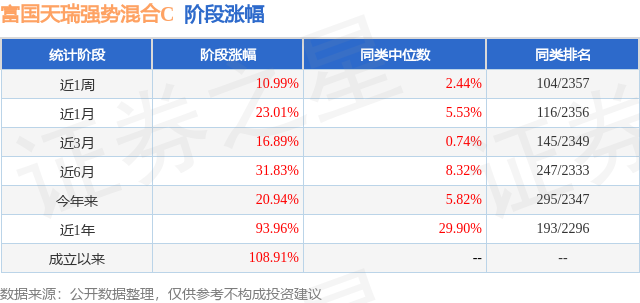从业绩表现来看,富国天瑞强势混合C基金过去一年净值涨幅为93.96%,在同类基金中排名193/2296,同类基金过去一年净值涨幅中位数为29.9%。而基金过去一年的最大回撤为-14.51%,成立以来的最大回撤为-14.51%。
