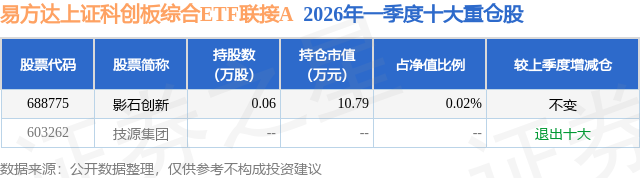 从基金规模来看,易方达上证科创板综合ETF联接A基金2026年一季度公布的基金规模为2.15亿元。该基金最新一期资产配置为:股票占净值比0.02%,无债券类资产,现金占净值比5.26%。从基金持仓来看,该基金当季前十大股票仓位达0.02%,第一大重仓股为影石创新(688775),持仓占比为0.02%。