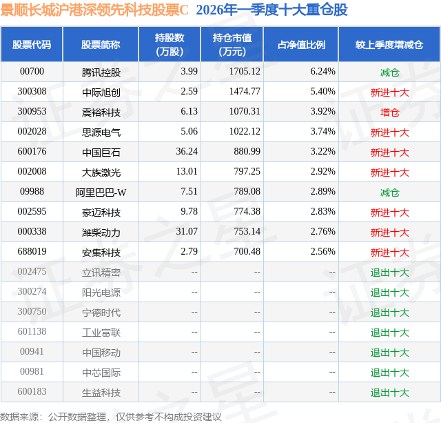 从基金规模来看,景顺长城沪港深领先科技股票C基金2026年一季度公布的基金规模为0.01亿元。该基金最新一期资产配置为:股票占净值比85.3%,债券占净值比1.98%,现金占净值比7.8%。从基金持仓来看,该基金当季前十大股票仓位达36.48%,第一大重仓股为腾讯控股(00700),持仓占比为6.24%。