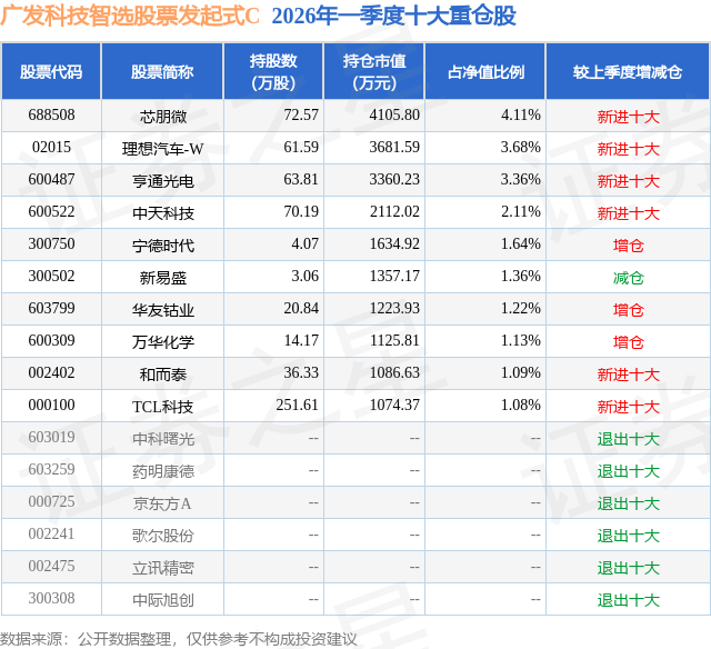 证券之星消息,日前广发科技智选股票发起式C基金公布一季报,2026年一季度最新规模4.12亿元,季度净值涨幅为4.08%。