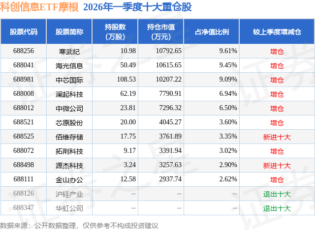 从基金规模来看,科创信息ETF摩根基金2026年一季度公布的基金规模为11.23亿元,较上一期规模7418.09万元变化了10.49亿元,环比变化了1414.09%。该基金最新一期资产配置为:股票占净值比99.63%,无债券类资产,现金占净值比0.39%。从基金持仓来看,该基金当季前十大股票仓位达57.08%,第一大重仓股为寒武纪(688256),持仓占比为9.61%。