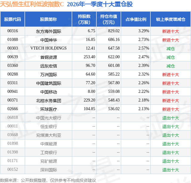 从基金规模来看,天弘恒生红利低波指数C基金2026年一季度公布的基金规模为0.66亿元。该基金最新一期资产配置为:股票占净值比94.94%,无债券类资产,现金占净值比5.93%。从基金持仓来看,该基金当季前十大股票仓位达24.56%,第一大重仓股为东方海外国际(00316),持仓占比为3.29%。