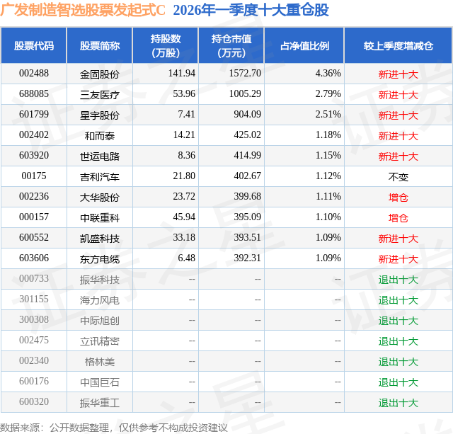 从基金规模来看,广发制造智选股票发起式C基金2026年一季度公布的基金规模为2.91亿元。该基金最新一期资产配置为:股票占净值比94.67%,债券占净值比1.44%,现金占净值比4.84%。从基金持仓来看,该基金当季前十大股票仓位达17.5%,第一大重仓股为金固股份(002488),持仓占比为4.36%。